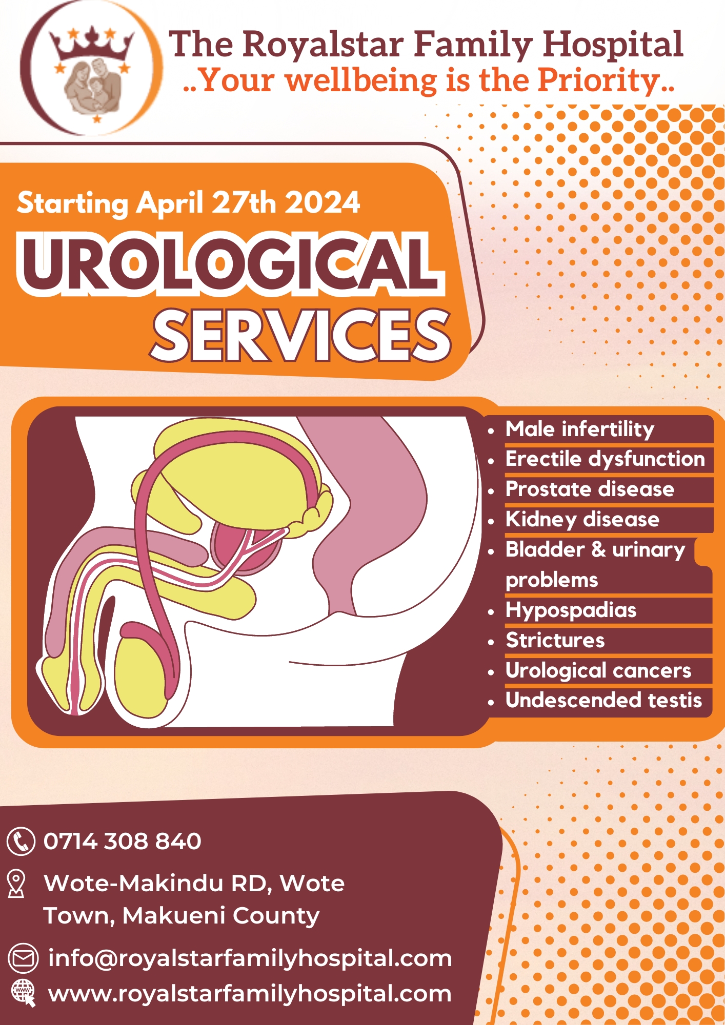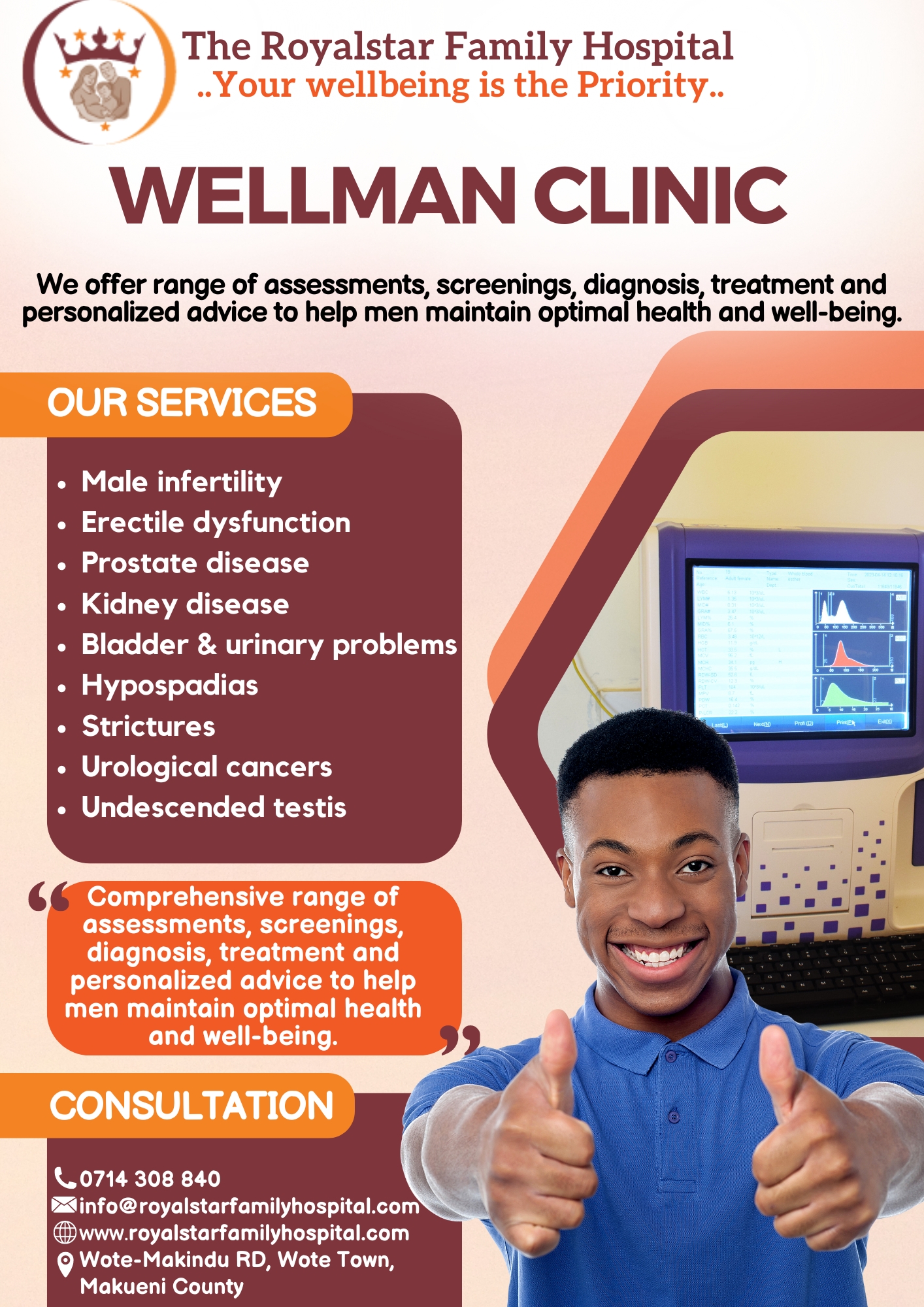 The Royalstar Family Hospital Ltd is a patient centered institution that was established in September 2019. It is located in Wote town along Wote-Makindu road, Makueni County.